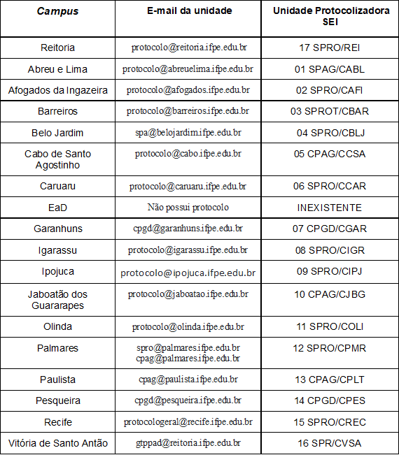 E-mail da unidade/setor para atendimento e solicitações: protocolo@reitoria.ifpe.edu.br