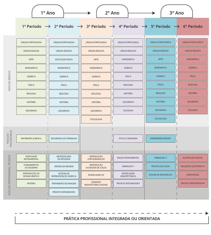 Os estudantes percorrerão todas as disciplinas ligadas aos módulos de Linguagens e suas Tecnologias, Matemática e suas Tecnologias, Ciências da Natureza e suas Tecnologias e Ciências Humanas e Sociais Aplicadas. Ao mesmo tempo, desenvolverão atividades relativas às disciplinas técnicas como tratamento de som, imagem e efeitos especiais, produção textual, criação de roteiro, ilustração e animação, desenho assistido por computador, desenvolvimento de aplicativos e conteúdo para web e maquetes eletrônicas.
