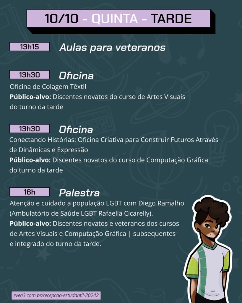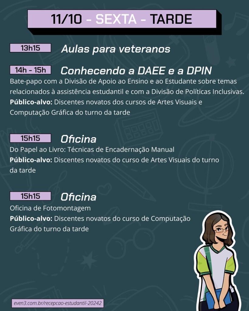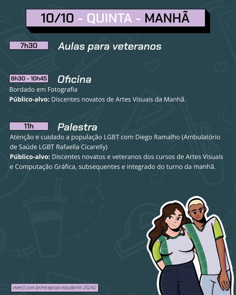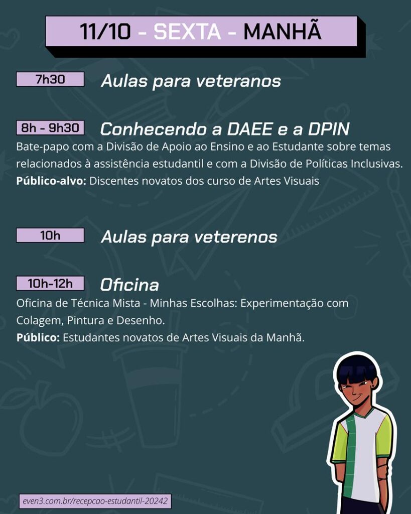 A programação de recepção conta com bate-papo com egressos, apresentação do CAOS , conversa com as coordenações de curso, além de palestras sobre saúde mental, movimento estudantil e cuidado com a população LGBTQIA+. Os estudantes novatos deverão realizar as inscrições em oficinas específicas pelo endereço https://www.even3.com.br/recepcao-estudantil-20242/