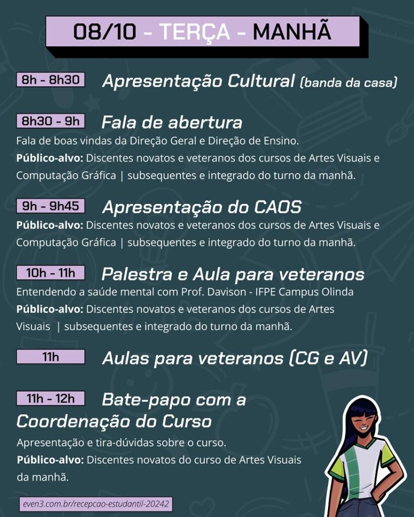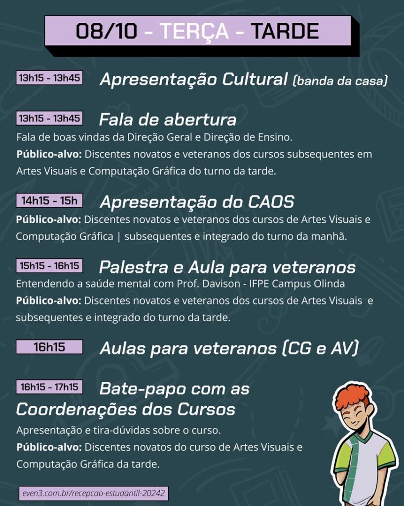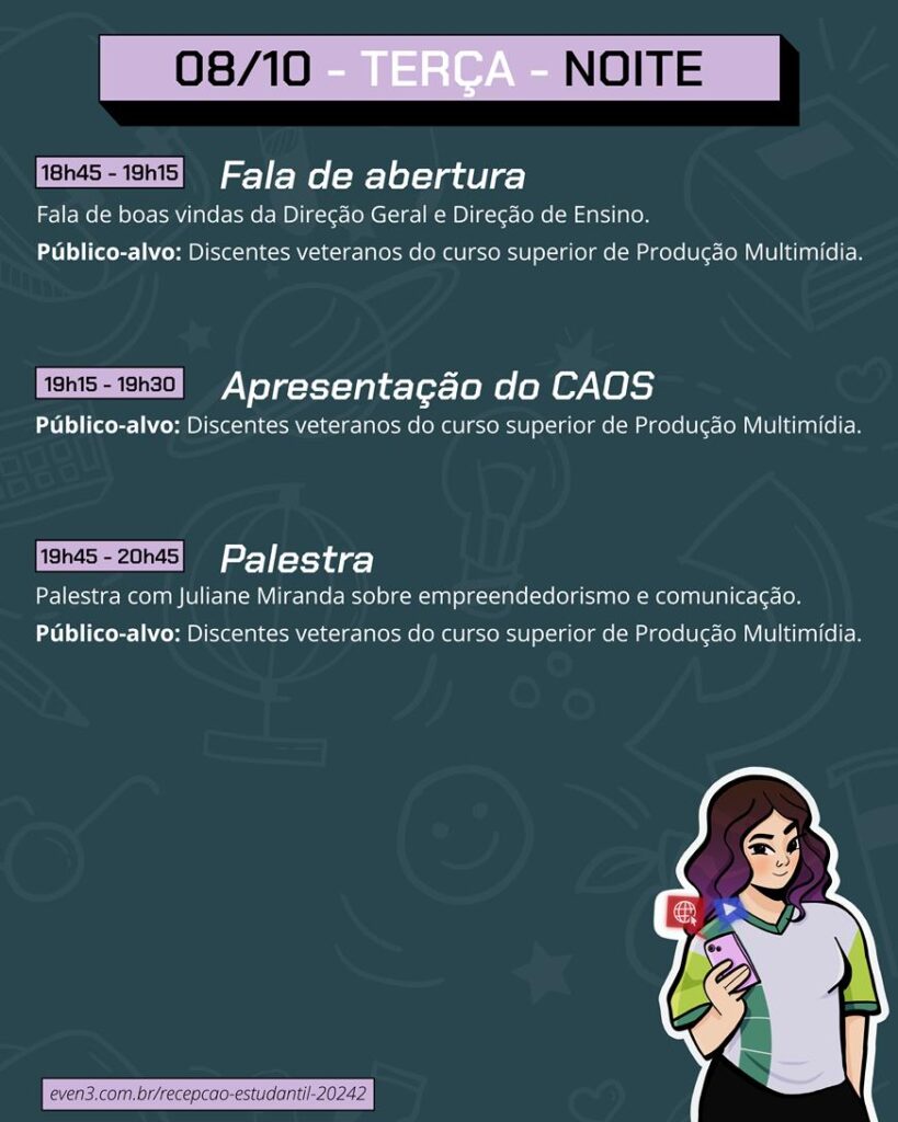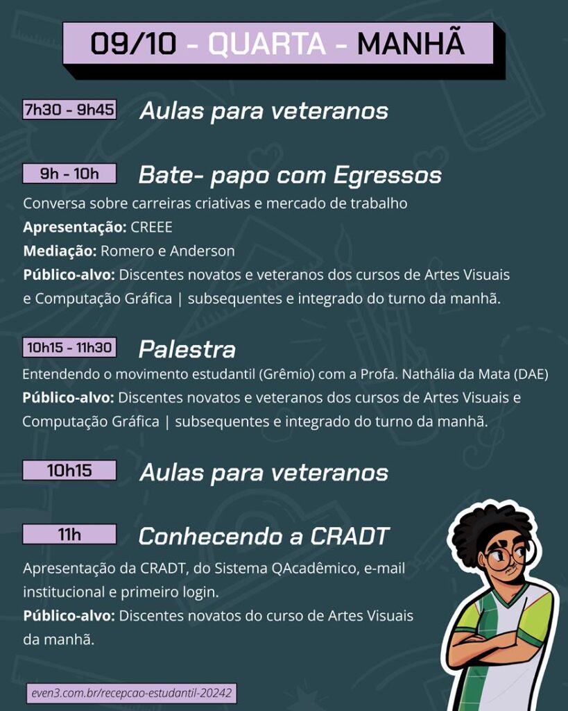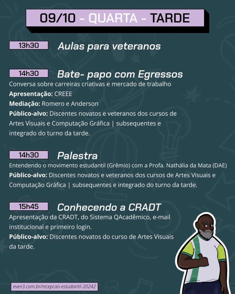 A programação de recepção conta com bate-papo com egressos, apresentação do CAOS , conversa com as coordenações de curso, além de palestras sobre saúde mental, movimento estudantil e cuidado com a população LGBTQIA+. Os estudantes novatos deverão realizar as inscrições em oficinas específicas pelo endereço https://www.even3.com.br/recepcao-estudantil-20242/