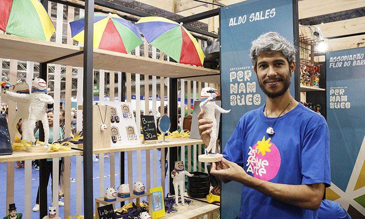 Pelo estande do PAPE, quem marcou presença foi Aldo Sales, também estudante de Artes Visuais. Ele expôs peças em porcelana fria e destacou a importância dos programas de apoio ao artesanato: “Só o fato de não precisar pagar por um estande já ajuda muito quem está começando. A Fenearte é uma janela para o mundo. É onde seu trabalho é reconhecido.”