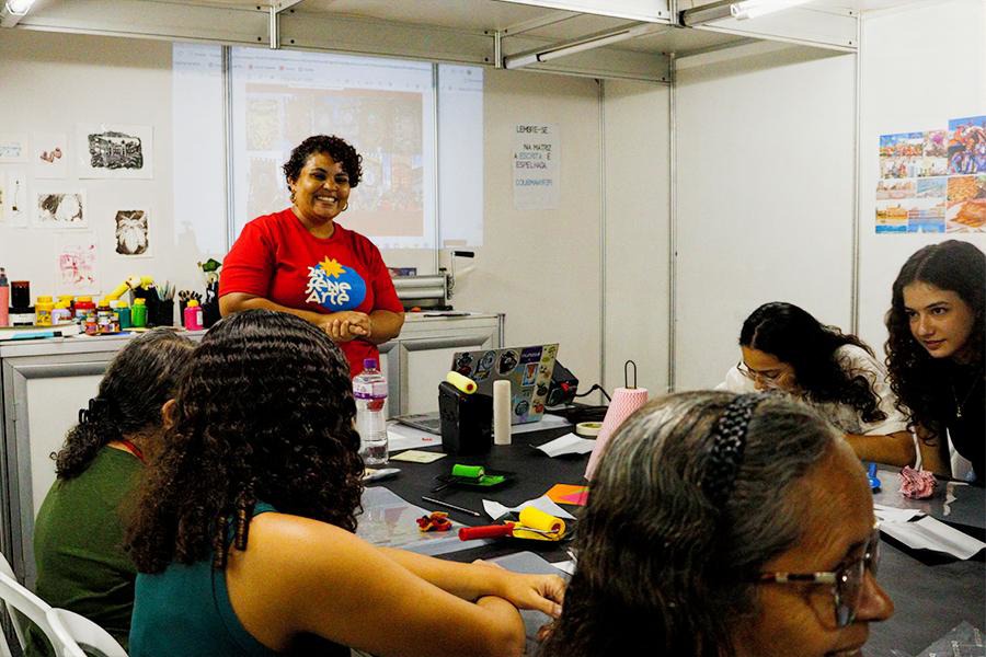 “A oficina é fruto direta do que a gente vem desenvolvendo no LEG. Trabalhamos com materiais acessíveis, como isopor, embalagem de leite, lápis, tinta guache. Tudo pensado para que a gravura possa ser feita em casa, por qualquer pessoa”, explica Tati. Segundo ela, ministrar a oficina na Fenearte amplia a experiência do grupo de pesquisa: “Já realizamos essa oficina no IFPE e na Arte Plural, agora ganhamos ainda mais vivência para, no futuro, criarmos um manual técnico.”