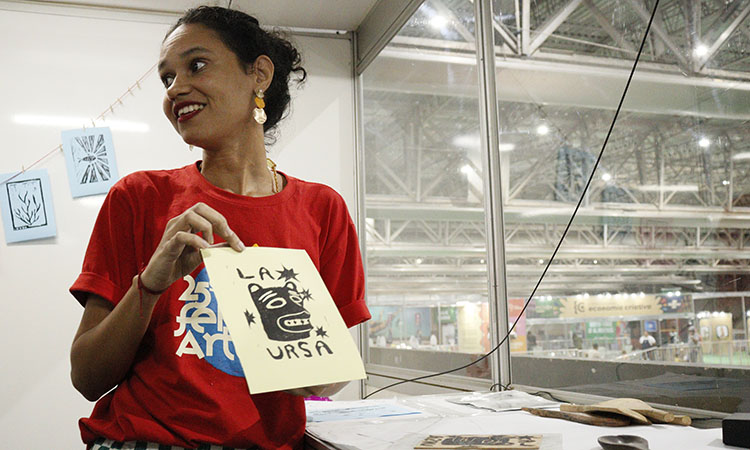 A estudante Tatiane Alves Santos, do curso técnico em Artes Visuais, foi uma das dezenas de representantes do Campus Olinda. Pelo edital da Secretaria da Mulher, ela não apenas expôs seus produtos como também ministrou uma oficina voltada à produção de gravura com materiais alternativos, uma proposta que surgiu no projeto de pesquisa do qual participa no Laboratório de Experimentação Gráfica (LEG), coordenado pela professora Luciene Pontes.