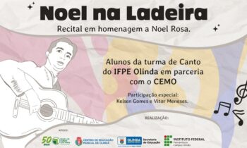O recital em homenagem a Noel Rosa que havia sido cancelado em virtude das chuvas tem nova data. O evento ocorrerá às 19h30, na terça-feira (8), no Centro de Cultura Luiz Freire, que fica no sítio histórico. A apresentação marca o encerramento do primeiro semestre do curso de formação Canto Popular, oferecido pelo IFPE Olinda em parceira com o Centro de Educação Musical de Olinda (CEMO). Os ingressos serão distribuídos 1h antes, no local do evento, até a limitação do espaço.