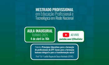 O Programa de Pós-Graduação em Educação Profissional e Tecnológica (ProfEPT) realiza sua aula inaugural nacional no dia 4 de abril, a partir das 16h. Neste ano, está programada a palestra “Princípios Educativos para a formação de profissionais da EPT: bases para a formação humana integral e para a transformação social”, com a professora Lucília Regina de Souza Machado, da Universidade Federal de Minas Gerais (UFMG). A aula será transmitida, ao vivo, via canal do Cefor no YouTube: youtube.com/user/CanalCeadIfes.