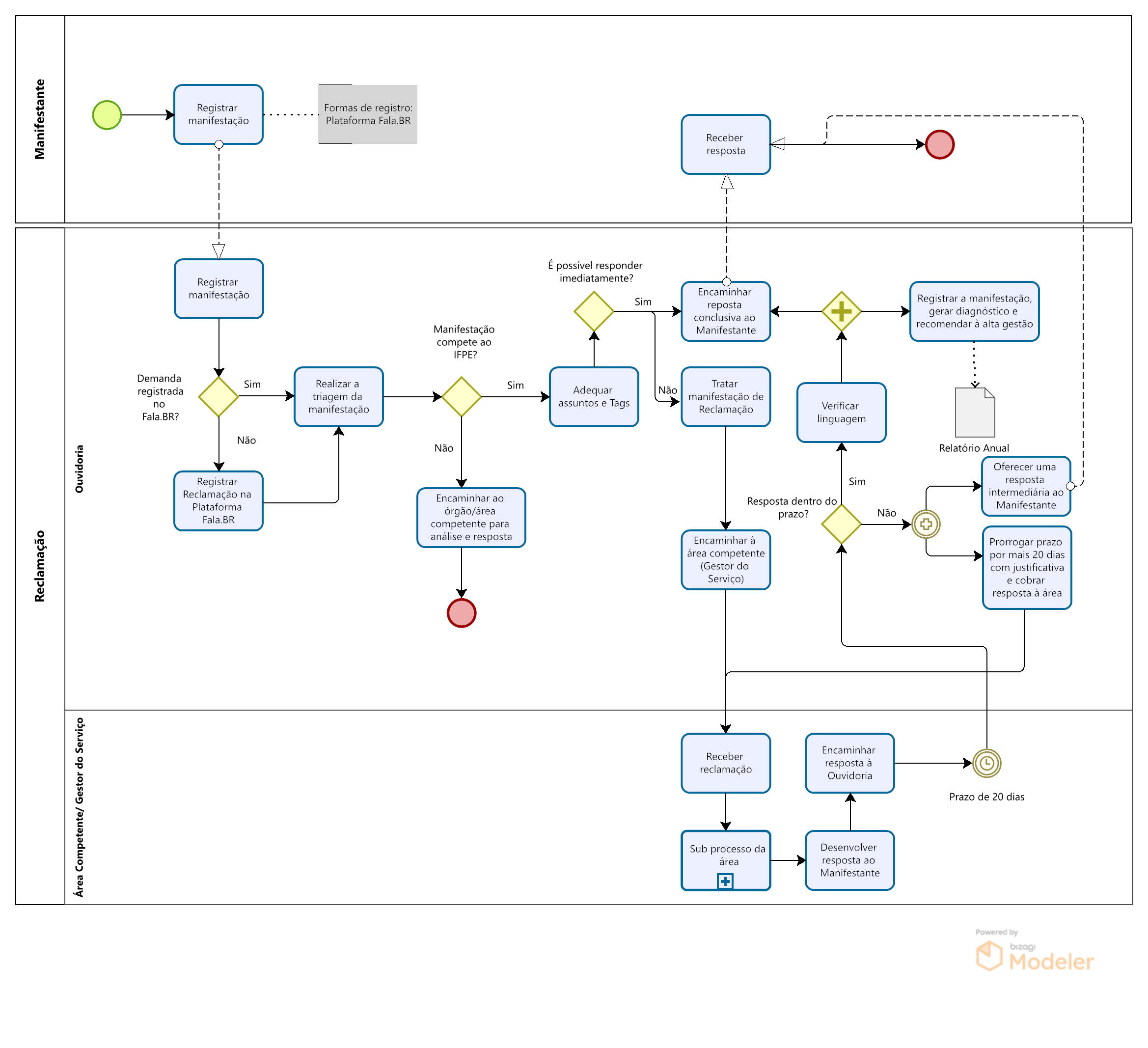 - Reclamação: tipo de manifestação que demonstra insatisfação relativa a um serviço prestado, atendimento recebido ou outras situações correlatas no âmbito do serviço público.