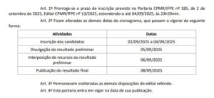 >> Veja a portaria CPMR/IFPE  188/2025, que retifica o Edital CPMR/IFPE 13/2025