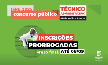 O Instituto Federal de Pernambuco (IFPE) prorrogou, até a próxima segunda-feira (08/09), as inscrições do concurso público para cargos técnico-administrativos em Educação (TAE’s). Com a prorrogação, o último dia para efetuar o pagamento da taxa de inscrição passa a ser 09 de setembro. A depender do cargo escolhido, essa taxa varia entre R$75, R$120 e R$150, podendo ser paga via Pix ou boleto bancário.