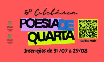 Seguem abertas, até o dia 29/08, as inscrições para submissão de poemas para a 5ª edição da Coletânea Poesia de Quarta, uma parceria entre o Campus Pesqueira do IFPE e o Núcleo de Comunicação, Cultura e Artes (NUCCA) do Campus Cajazeiras do IFPB, que visa promover a produção e a difusão da poesia como expressão da literatura e das artes, por meio de uma ação de extensão continuada promovida por ambas as Instituições.