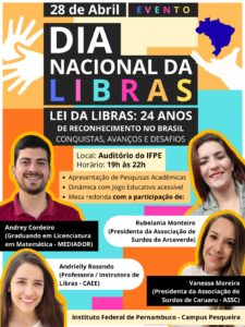 Para celebrar o Dia Nacional da Libra, estudantes da disciplina de Libras dos cursos de Bacharelado em Enfermagem, Bacharelado em Engenharia Elétrica e Licenciatura em Matemática do IFPE Pesqueira promovem, na próxima terça-feira, 28/04, às 19h, no auditório do Campus, evento alusivo aos 24 anos de sanção da Lei que reconhece a Língua Brasileira de Sinais (Libras) como meio legal de comunicação e expressão da comunidade surda no Brasil.