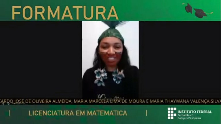 A primeira a falar foi a oradora da Licenciatura em Matemática, Maria Marcela de Lima. Mais uma entre tantas e tantos indígenas Xukurus que já se formaram no Campus Pesqueira do IFPE, ela começou o discurso honrando a tradição de seu povo: “Peço licença à Força Encantada para proferir minhas singelas palavras”, e acrescentou após os cumprimentos, “cada um aqui vai deixar um pedacinho seu no IFPE, seja através do Pibid, do Pibex, do Pibic, do Clube de Matemática, da Semana de Matemática, do Movimento Estudantil, dos jogos internos ou da capa de uma revista. Iremos levar conosco não apenas um diploma, mas levaremos ensinamentos que jamais teríamos adquirido senão através do IFPE”, asseverou a agora professora.