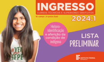 Foram divulgadas, nesta quinta-feira (4), as listas preliminares da Heteroidentificação e da aferição da condição de indígena do Processo de Ingresso 2024.1 do IFPE. As listas estão disponíveis no site da IAUPE (http://www.upenet.com.br/ingresso_ifpe_2024.1) e no site ingresso.ifpe.edu.br (para os cursos técnicos dos Campi de Barreiros, Belo Jardim e Vitória de Santo Antão).