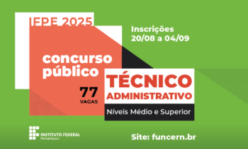 O Instituto Federal de Educação, Ciência e Tecnologia de Pernambuco (IFPE) lançou novo edital de concurso público com a oferta de 77 vagas para cargos técnico-administrativos em Educação com atuação em diversas áreas da instituição. As inscrições vão ocorrer de 20 de agosto a 04 de setembro, exclusivamente, através do site da Fundação de Apoio à Educação e ao Desenvolvimento Tecnológico do Rio Grande do Norte (Funcern), banca organizadora do certame.