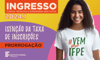 O Instituto Federal de Educação, Ciência e Tecnologia de Pernambuco (IFPE) prorrogou o prazo para solicitar a isenção da taxa de inscrição no Processo de Ingresso 2024.1 para novos/as estudantes. Agora, os/as candidatos/as têm até este sábado, 11 de novembro, para realizar o pedido. Acesse aqui o cronograma retificado.