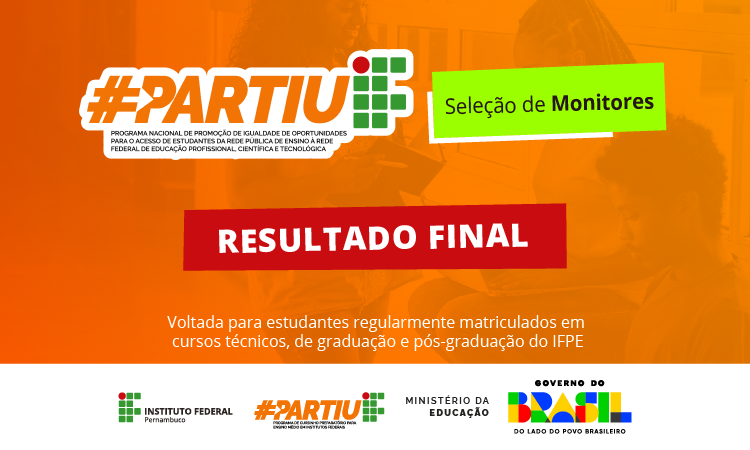 O Instituto Federal de Pernambuco (IFPE) publicou, nesta segunda-feira (6), o resultado final da seleção para estudantes da instituição que irão atuar como monitores/as no Programa Partiu IF 2026.