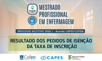 Foi divulgado, nesta segunda-feira, 13/10, o resultado preliminar das solicitações de isenção da taxa de inscrição para o processo seletivo do Mestrado Profissional em Enfermagem – Acordo CAPES/COFEN, que é regulado pelo edital CPES/IFPE nº 25/2025. De acordo com o item 8.1 do edital, dos resultados de cada uma das etapas do processo seletivo caberá recurso para a comissão de seleção ou banca examinadora.