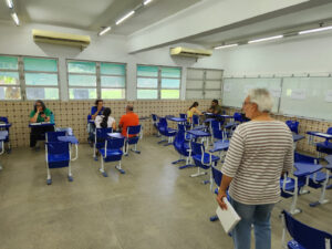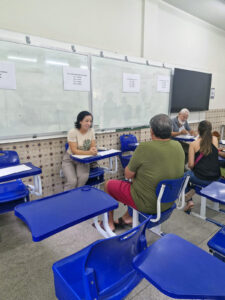O segundo momento foi organizado para que as famílias pudessem conversar e conhecer os/as professores/as dos/as seus/suas filhos/as. O atendimento pedagógico dos/as docentes ocorreu em salas do bloco B, onde os/as professores/as ficaram agrupados/as por componentes curriculares, facilitando a recepção das dúvidas sobre o aproveitamento acadêmico de cada estudante.