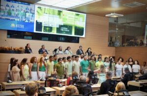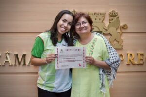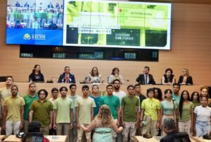 Um microonibus e uma van levaram estudantes e participantes do Coral até a Câmara Municipal do Recife. Grande parte dos alunos teve que se acomodar nas galerias, pois os locais de honra foram ocupados pelos homenageados e por autoridades. Mas isso não tirou o brilho do momento: como disse Miulki Araújo, que tem 18 anos e é estudante do Ensino Médio Integrado em Eletrotécnica, “mesmo assistindo lá de cima, pudemos sentir a importância da cerimônia”. “O IFPE também foi construído por estudantes, e nós fazemos parte dele, seja em grandes eventos como este, seja no dia a dia do campus”, afirmou Miulki que, além de suas atividades regulares, é vice presidente do Grêmio Estudantil do IFPE Recife e voluntária no CHMD.