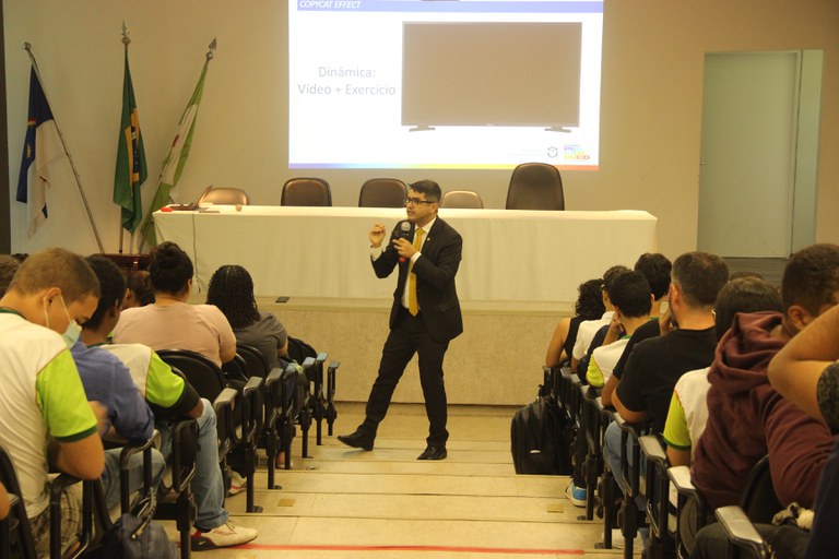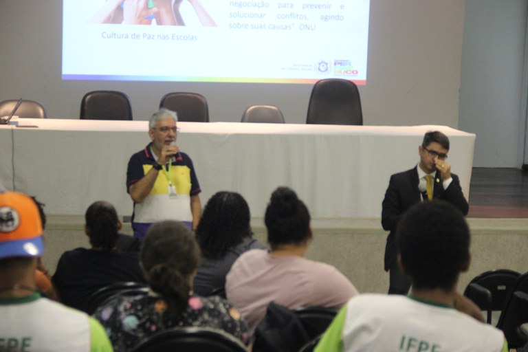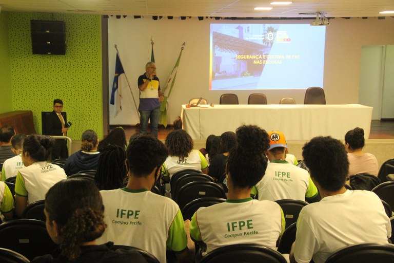 A comunidade acadêmica lotou o auditório do Campus Recife, na manhã desta segunda-feira (17), para participar da palestra “Segurança e cultura de paz nas escolas”, ministrada pelo gerente-geral de Articulação, Integração Institucional e Comunitária da Secretaria Estadual de Defesa Social (SDS), coronel Ivanilton Cesar Torres de Medeiros.