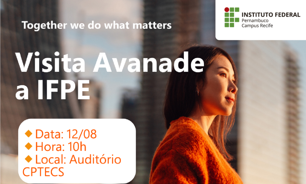 O auditório do Centro de Pesquisa do IFPE Campus Recife será palco da palestra apresentada pela empresa Avanade, principal fornecedora global de serviços digitais, nuvem e consultoria, soluções de indústria e experiências guiadas pelo design em todo o ecossistema Microsoft.