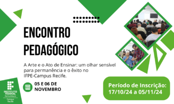 A comunidade docente e de profissionais ligados ao Ensino do IFPE Recife se reúne, a partir do dia 05 de novembro, no Encontro Pedagógico do semestre letivo 2024.2. O encontro de formação continuada terá por tema: “A Arte e o Ato de Ensinar – um olhar sensível para permanência e o êxito no IFPE Campus Recife”.