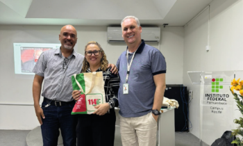 O Coordenador Rogério Pinto do Curso de Segurança do Trabalho, junto com os docentes Rogério Mota e Ebenezer Santos, receberam a engenheira de Segurança do Trabalho no miniauditório do Campus Recife.