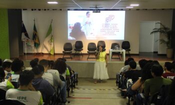 O evento contou com a participação da psicóloga Sandra Roberta, adepta da Terapia Cognitiva Comportamental (TCC). A facilitadora ministrou a palestra de abertura “Estudo, saúde mental e bem-estar”, abordando os desafios em termos emocionais da comunidade discente na vida acadêmica, a exemplo da ansiedade no contexto de provas e cobranças em período de processos seletivos. “A ansiedade atrapalha; ela paralisa”, alertou a profissional.