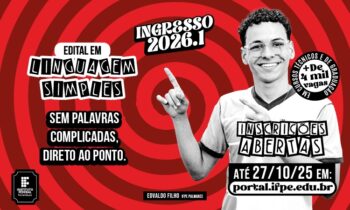 O Instituto Federal de Pernambuco (IFPE) acaba de lançar a versão do Edital do Processo de Ingresso 2026.1 em Linguagem Simples. A versão está sendo disponibilizada para os/as candidatos/as a partir desta quinta-feira (09). O processo de seleção está com inscrições abertas até o dia 27 de outubro.