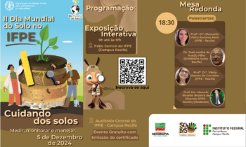 O projeto de Extensão “Solos – Aprender e conservar” e o curso de Licenciatura em Geografia do IFPE Recife comemoram, pela segunda vez, o Dia Mundial do Solo, celebrado em 05 de dezembro. O encontro para marcar a data será realizado nesse dia, sob o tema “Cuidando dos solos: medir, monitorar e manejar”.