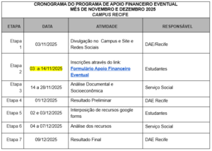 A solicitação do Apoio Financeiro Eventual está condicionada à situação de extrema vulnerabilidade do estudante e à disponibilidade orçamentária do Campus Recife. Diante da restrição orçamentária atual, serão priorizadas as solicitações de estudantes que não foram contemplados pelo Programa de Apoio à Manutenção Acadêmica e que não são contemplados pelo Programa Pé-de-Meia no semestre letivo atual.