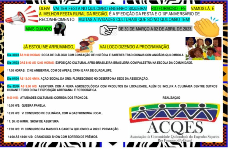 No próximo domingo (2), será realizada a 9ª Festa de Reconhecimento do Quilombo Engenho Siqueira, localizado na cidade de Rio Formoso-PE.