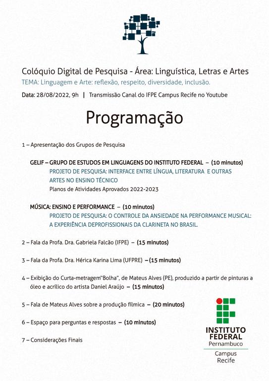O evento virtual será conduzido por representantes de grupos de pesquisa das áreas de Linguística, Letras e Artes e o tema do encontro será Linguagem e Arte: reflexão, respeito, diversidade, inclusão.