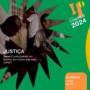 A obra escolhida para o encontro é “Justiça”, documentário de Maria Augusta Ramos, que direciona a câmera para um Tribunal de Justiça no Rio de Janeiro, acompanhando o cotidiano de personagens. Há os que trabalham ali diariamente (defensores públicos, juízes, promotores) e os que estão de passagem (réus). O grupo vai levantar o debate: É justo prender um faminto que roubou pão para comer?