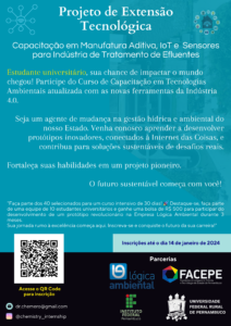 Projeto do IFPE Recife aprovado em edital do Programa de Extensão Tecnológica (PET) da Fundação de Amparo à Ciência e Tecnologia do Estado de Pernambuco (FACEPE) convoca estudantes de nível superior para curso de capacitação e imersão tecnológica. A partir da proposta do professor Romero Assis “Desenvolvimento Avançado de Protótipos Eletroquímicos”, o campus abre inscrições de discentes, entre eles/as os de Gestão Ambiental e Tecnologia em Análise e Desenvolvimento de Sistemas (TADS), para curso de Capacitação em Manufatura Aditiva, IoT e Sensores Inteligentes para Tratamento de Efluentes Industriais. A iniciativa, voltada a estudantes das áreas de ciência, tecnologias, engenharias e matemática (STEM) do IFPE ou de outras instituições, terá coordenação do IFPE Recife em parceria com a UFRPE e a Empresa Lógica Ambiental.