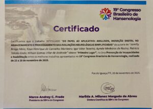 O artigo “Do papel ao aplicativo: ANS2JSON, inovação digital no armazenamento e processamento das avaliações neurológicas simplificadas”, fruto do Trabalho de Conclusão de Curso (TCC) da estudante Jamilly Melo, do curso de Tecnologia em Análise e Desenvolvimento de Sistemas do Campus Recife, conquistou o 1º lugar na área de Prevenção de Incapacidades e Reabilitação entre os melhores trabalhos apresentados no 19º Congresso Brasileiro de Hansenologia (CBH), realizado entre os dias 25 e 28 de novembro em Foz do Iguaçu, no Paraná.
