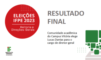 A Comissão Eleitoral Central divulgou, nesta terça-feira (5), o resultado final da consulta eleitoral para reitor do IFPE e diretores/as-gerais dos campi para o quadriênio 2024-2028. A Comunidade Acadêmica do Campus Vitória de Santo Antão elegeu o docente Lucas Dantas para ocupar o cargo de diretor-geral do Campus, com 39,92% dos votos. Os candidatos Alberto Belo e José Carlos da Costa receberam 20,60% e 19,85% dos votos, respectivamente.