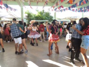 As festividades continuaram no turno da noite, com os alunos e alunas do curso de Licenciatura em Química. Teve forró, quadrilha junina, milho assado na hora e até um touro mecânico.