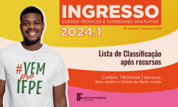 O Instituto Federal de Educação, Ciência e Tecnologia de Pernambuco (IFPE) divulgou a lista de classificação após os recursos dos/as candidatos/as aos cursos técnicos dos campi agrícolas Barreiros, Belo Jardim e Vitória de Santo Antão do Processo de Ingresso 2024.1. A lista pode ser conferida no site: ingresso.ifpe.edu.br.