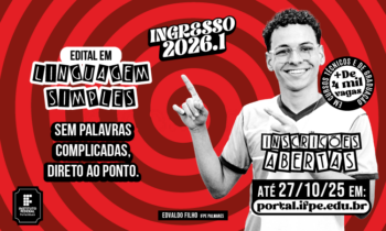 O Instituto Federal de Pernambuco (IFPE) acaba de lançar a versão do Edital do Processo de Ingresso 2026.1 em Linguagem Simples. A versão está sendo disponibilizada para os/as candidatos/as a partir desta quinta-feira (09). O processo de seleção está com inscrições abertas até o dia 27 de outubro.