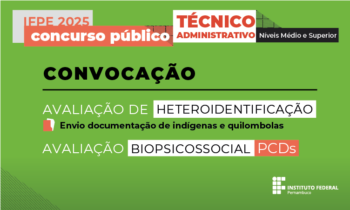 O Instituto Federal de Pernambuco (IFPE) publicou, nesta sexta-feira (21/11), o resultado final da prova objetiva do Concurso Público para Servidores Técnico-Administrativos, após análise de recursos.  Também foi publicada a convocação para as avaliações de heteroidentificação, biopsicossocial  e de pertencimento indígena ou quilombola.
