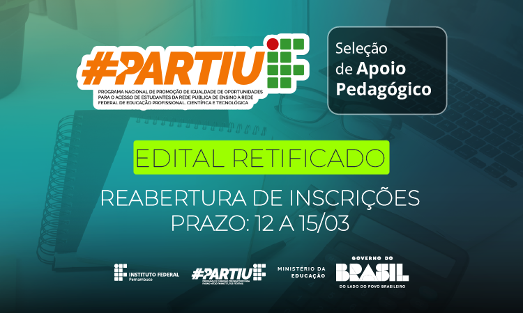 O Instituto Federal de Pernambuco (IFPE) publicou, nesta quarta-feria (11), edital retificado da seleção simplificada para apoio pedagógico do Programa PartiuIF 2026 a ser ofertado em cada um dos 16 campi da instituição.
