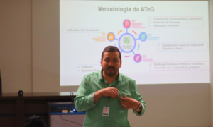 Jailton falou sobre o trabalho e os desafios no campo, explicou a metodologia da ATeG e falou sobre o potencial do setor. Ele também apresentou números importantes sobre a quantidade de propriedades rurais em Pernambuco e sobre os acompanhamentos prestados pelos assistentes técnicos e gerenciais.