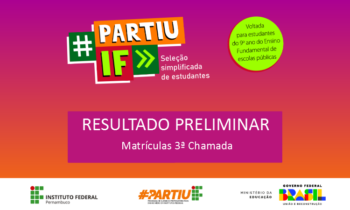 O IFPE Campus Vitória de Santo Antão divulgou, nesta segunda-feira (12), o resultado preliminar da 3ª chamada da seleção de estudantes para o Programa PartiuIF. A publicação do resultado final está prevista para terça-feira, dia 13 de maio.