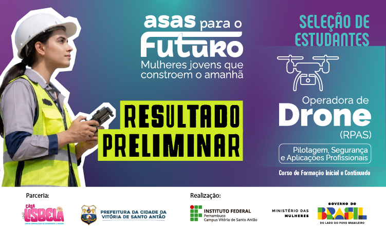 O IFPE Campus Vitória de Santo Antão divulgou, nesta segunda-feira (27), o resultado preliminar da seleção para o curso de Operadora de Drone (RPAS) – Pilotagem, Segurança e Aplicações Profissionais, ofertado pelo programa Asas para o Futuro.