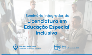 O IFPE Campus Vitória de Santo Antão realiza o I Seminário Integrador da Licenciatura em Educação Especial Inclusiva, entre os dias 7 e 12 de fevereiro. O evento tem objetivo de integrar os componente curriculares trabalhados pela nossa licenciatura no semestre.